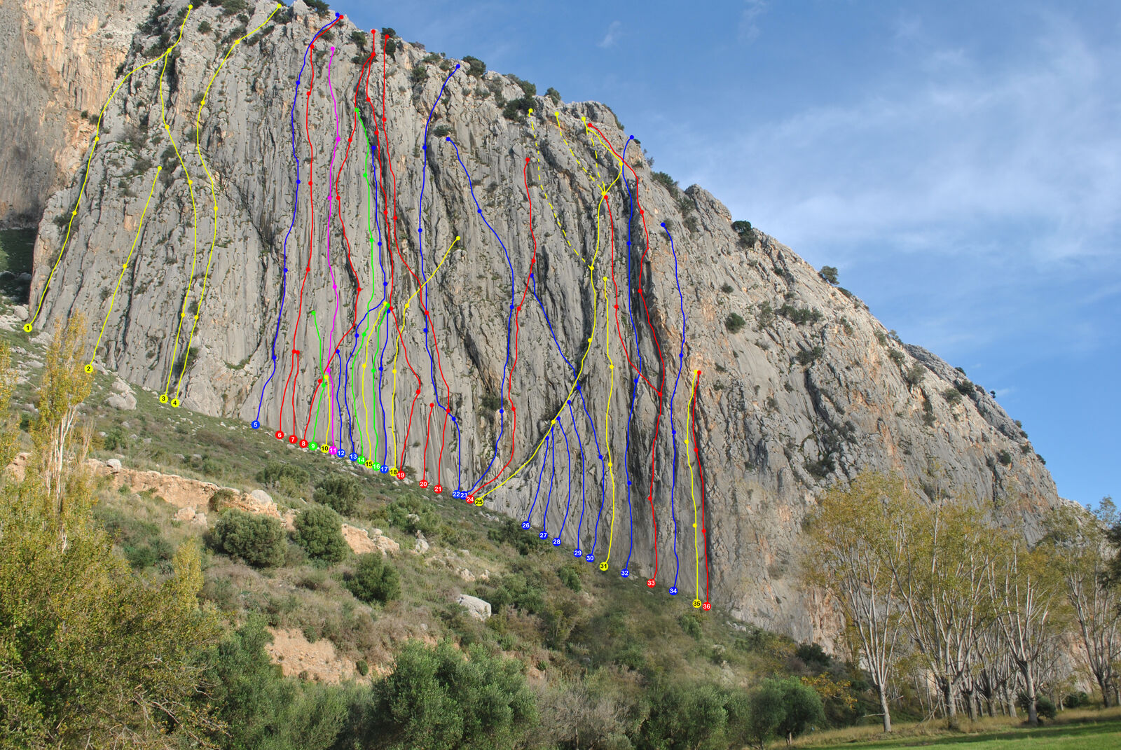 The first half is relatively easy (5b–5c), while the upper section becomes more demanding, with continuous 6a movement.