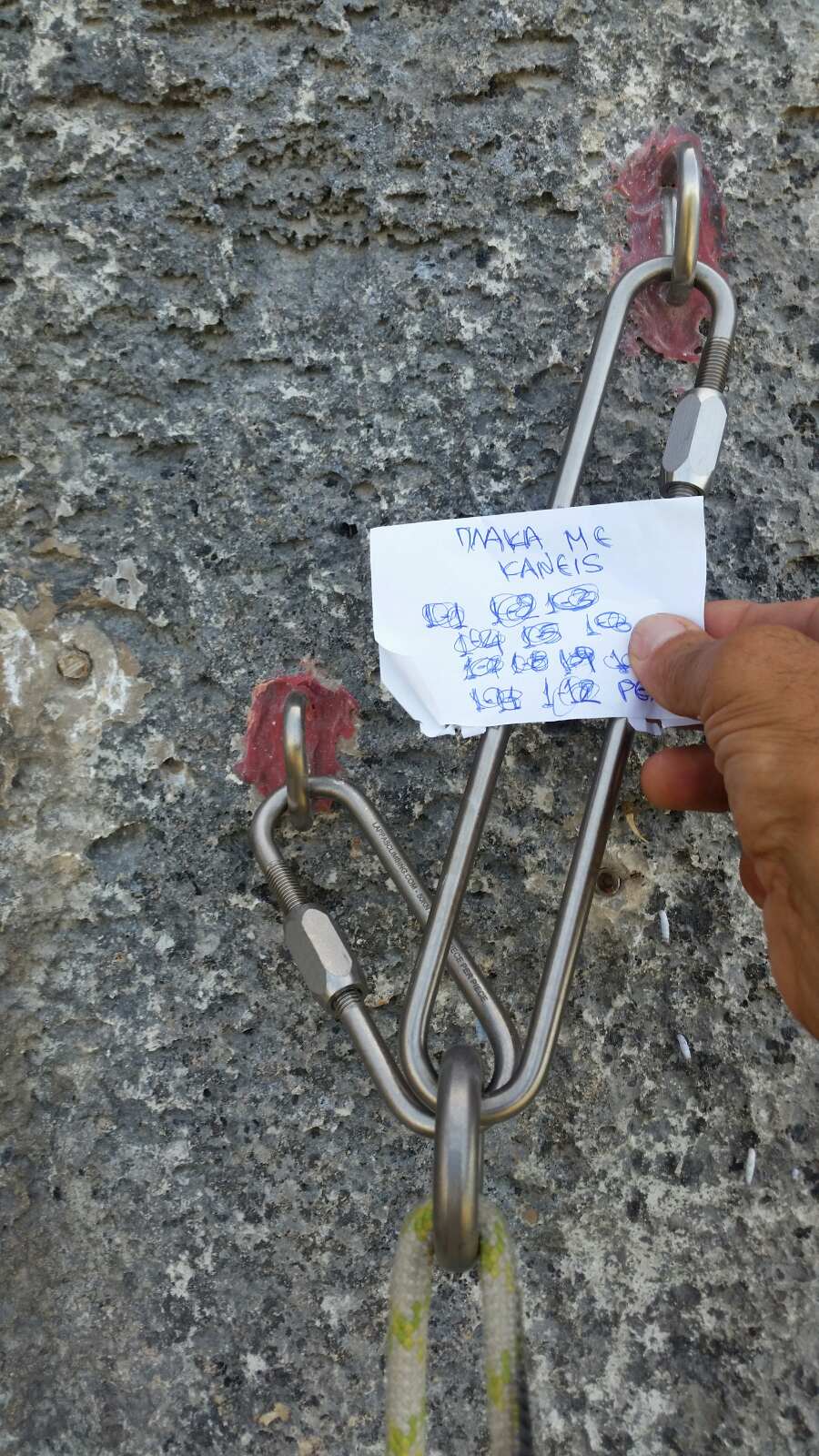 "Plaka me Kaneis" ("Slab with No One") is a demanding single-pitch sport route, 40 meters long, with a strong technical character and sparse, subtle moves on small footholds.